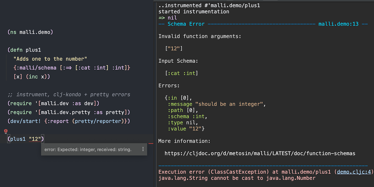 Running malli.dev instrumentation also emits clj-kondo type configs for all defns, enabling basic static type checking/linting for the instrumented functions.